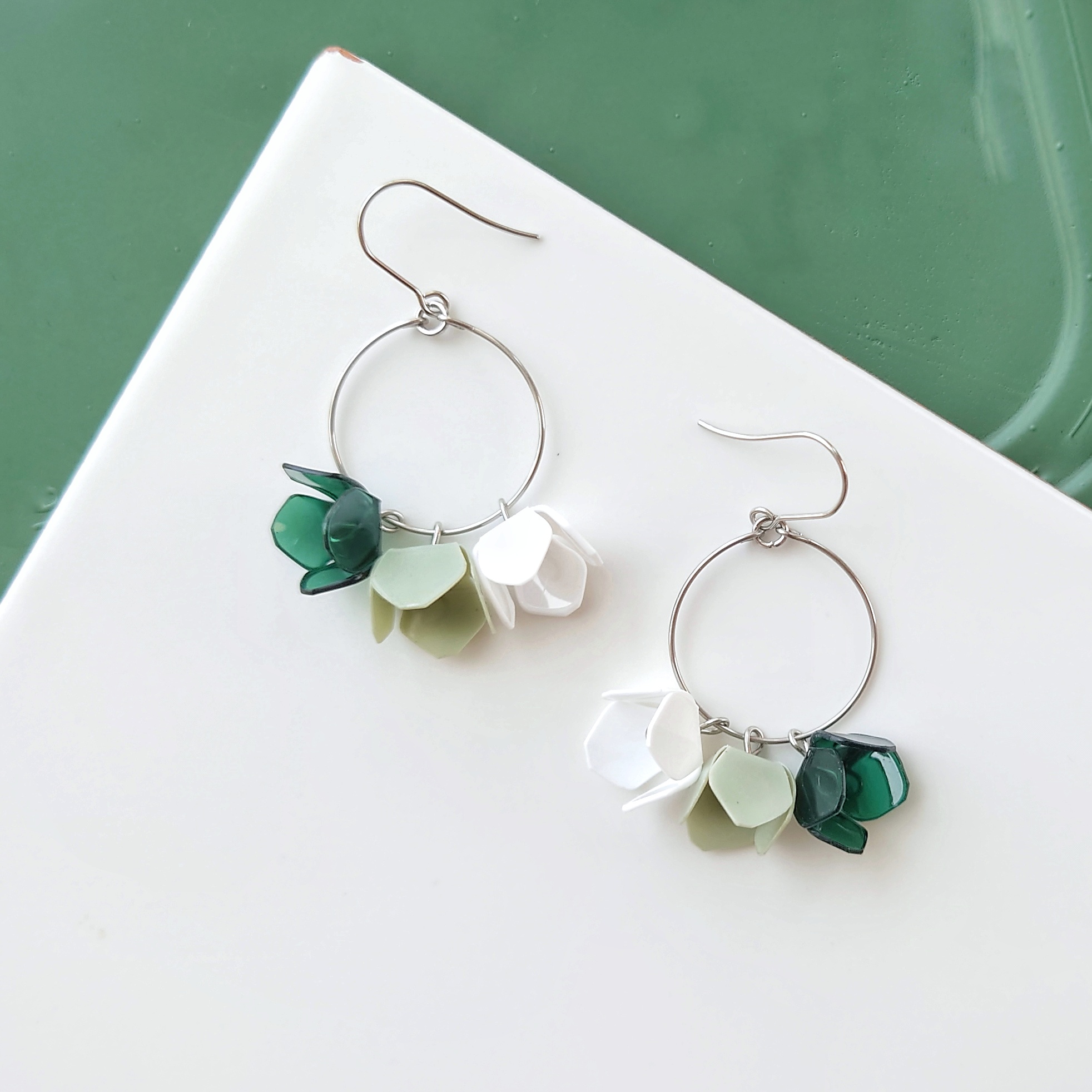 Erittäin kevyt korvakoru, jossa kolme ”nuppua” nipussa.